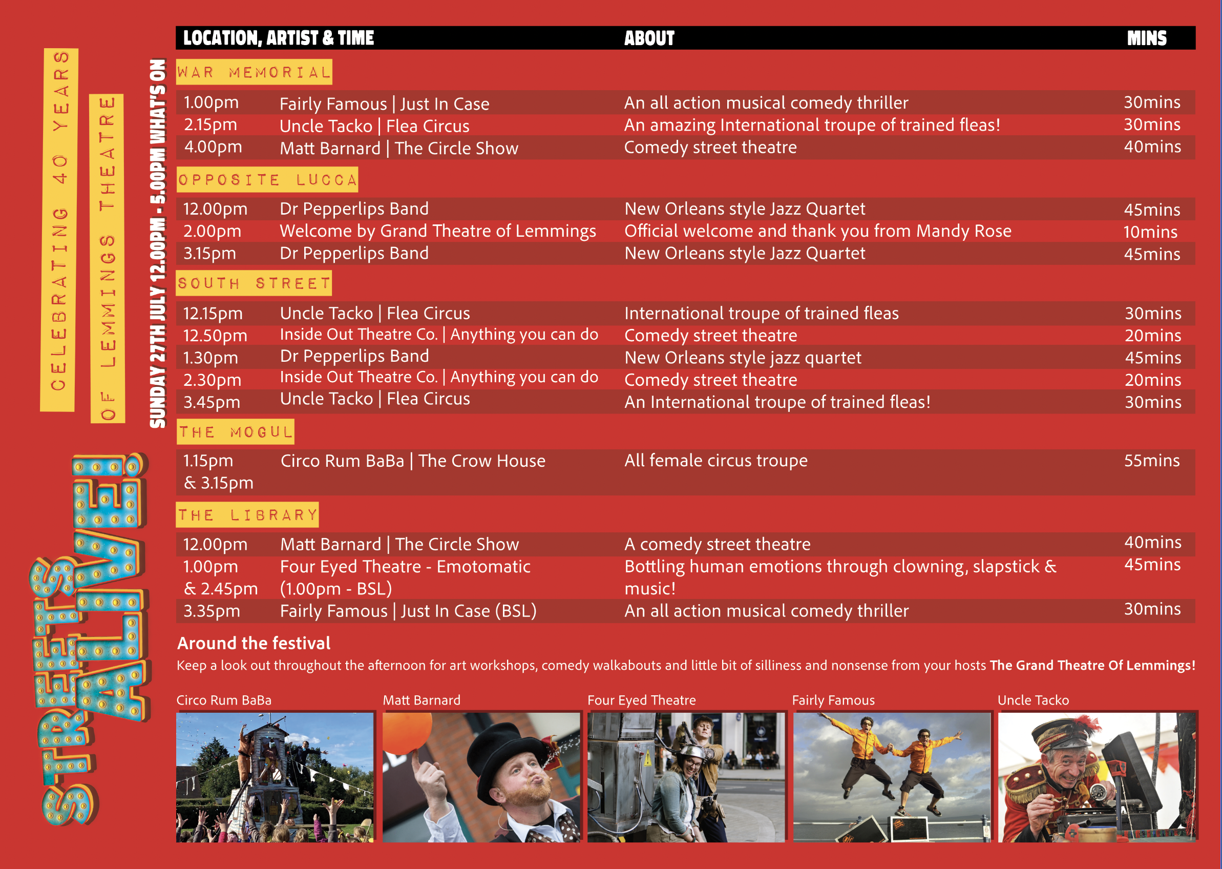 Together, let’s celebrate the history of Street Theatre, the history of The Lemmings and have a glorious day of fun!